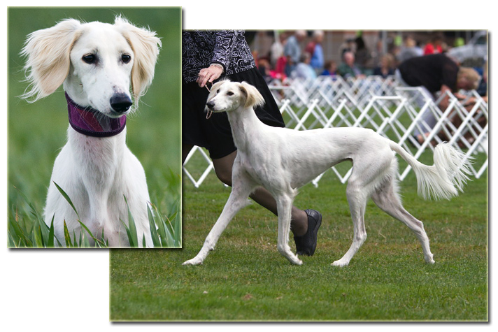 Sadik RFR Forbidden Breeze at Scimitar is a lemon and white parti girl who has made her home with Cathi Steiner in Kennewick Washington. Taboo is busy growing up and having fun with the Steiner family and the other Scimitar Salukis and is starting to venture out into the show ring. Recently she won Best in Sweepstakes at the Northern Cascades Saluki Fanciers Specialty show under breeder judge Ron Wassenaar. Taboo has a very bright future, indeed! (Photos by Mark Denson)